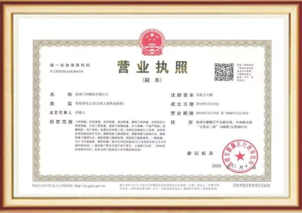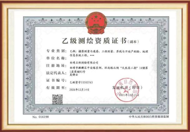 • 曲靖正矩測(cè)繪有限公司于2016年12月19日成立,注冊(cè)資金50萬(wàn)元,擁有:乙級(jí)測(cè)繪資質(zhì)、云南省土地登記代理機(jī)構(gòu)登記證書(shū)、通用航空企業(yè)經(jīng)營(yíng)許可證。